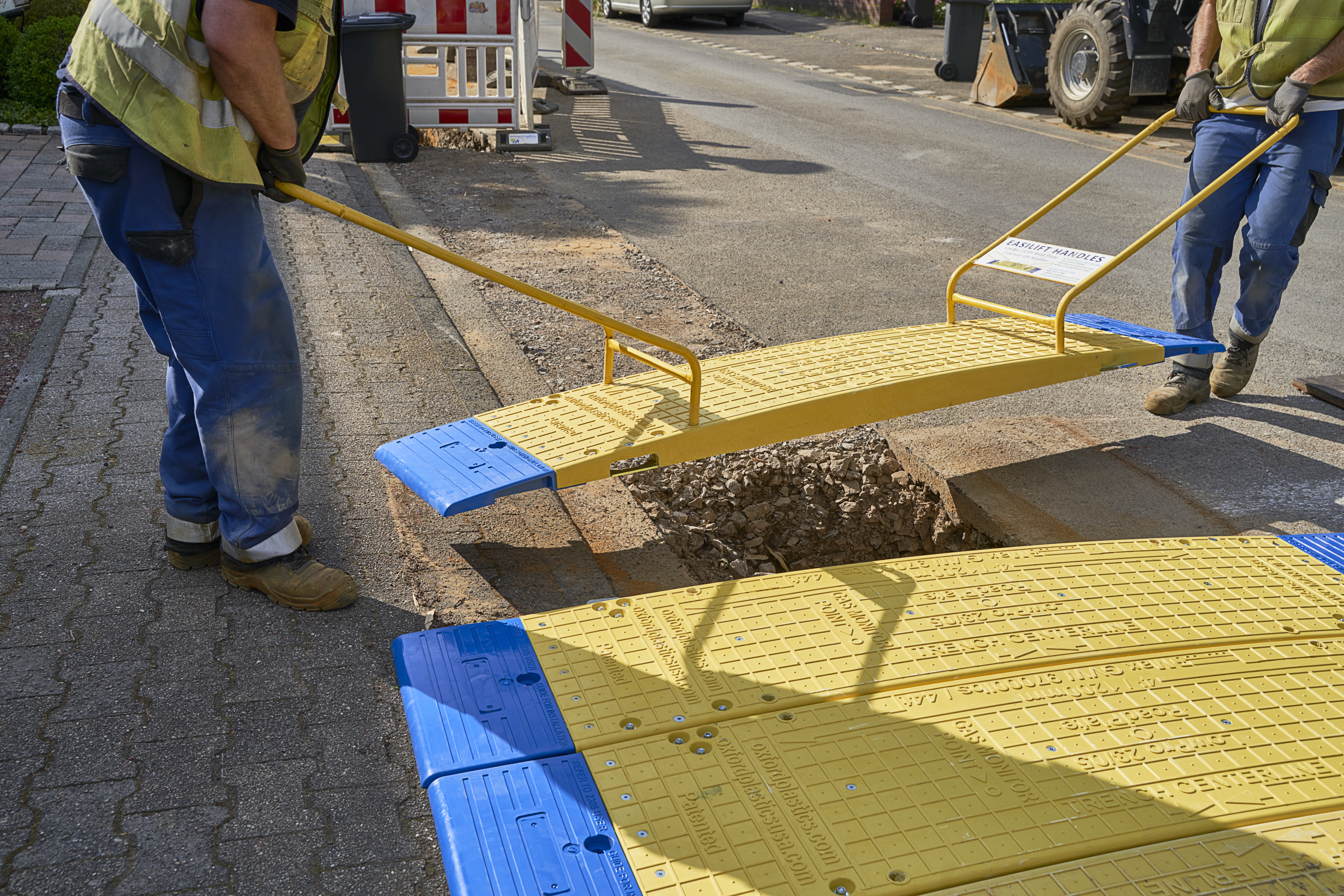 Une plaque peut être utilisée pour le franchissement de tranchée, un passage lors de travaux, une couverture de tranchée ou un accès réservé. - Solution conforme et responsable